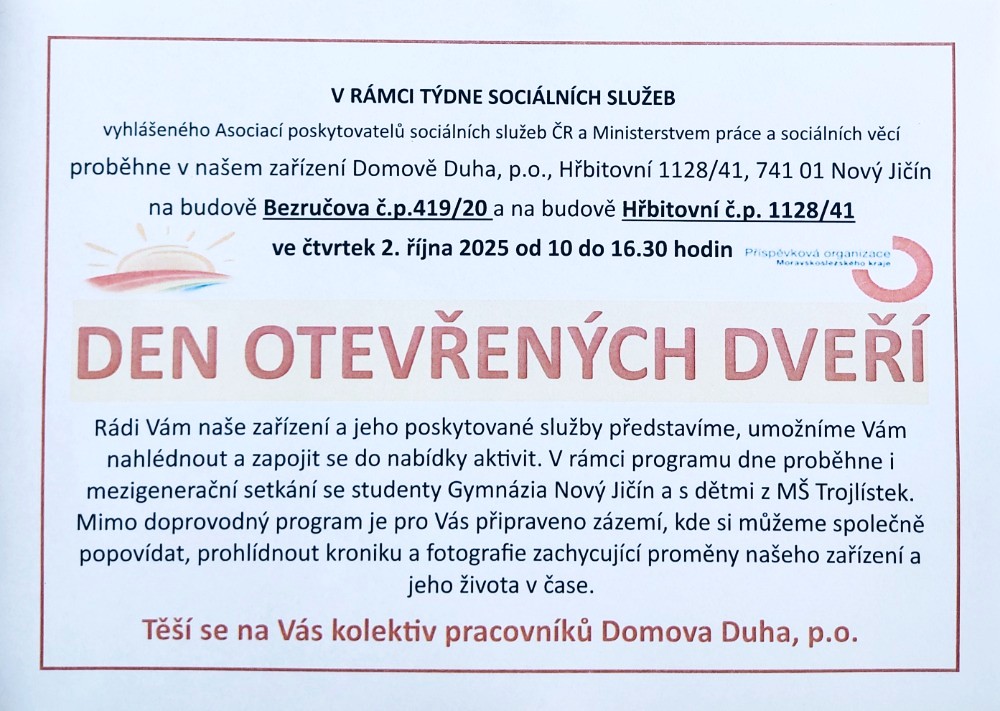 vyhlášeného Asociací poskytovatelů sociálních služeb ČR a Ministerstva práce a sociálních věcí proběhne v našem zařízení Domově Duha, p. o., Hřbitovní 1128/41, 741 01 Nový Jičín na budově Bezručova č.p. 419/20 a na budově Hřbitovní č.p. 1128/41 ve čtvrtek 2. října 2025 od 10 do 16.30 hodin
